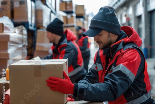 Couriers in uniform preparing the shipment of boxes