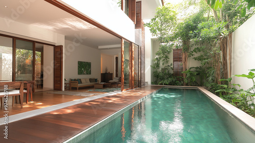 Courtyard in small house design in Singapore , Tropical landscape, white slat walls, wood, small pool, indoor living space, perfect exterior,