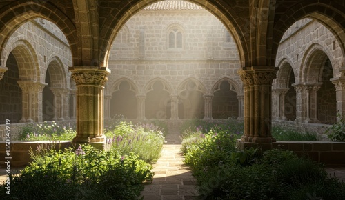 Courtyard with stone arches, garden and sunlight. Peaceful and serene.