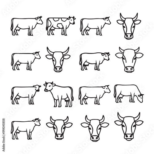 cow, cattle, farm animal, farm animal, herd, bull, dairy, beef, agriculture, ranch, icon, symbol, graphic, vector, illustration, outline, silhouette, line art, animal, mammal, bovine, grazing, domestic, farming, countryside, rural, nature, set, collection, isolated, white background, simple, modern, clean, drawing, vignetting, minimal, editable, design element, food, protein