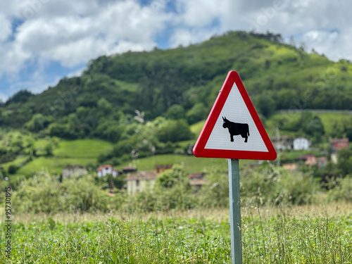 adventure, animal, asturias, caution, country, countryside, danger, day, field, grass, green, landscape, mountain, nature, nobody, outdoors, red, road, roadsign, rural, signs, sky, spain, summer, symbol, traffic sign, travel, warning, wild, wildlife