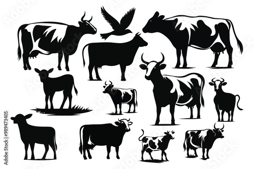 cow, vector, illustration, animal, farm, cattle, agriculture, milk, design, icon, silhouette, graphic, mammal, dairy, isolated, beef, farm animal, symbol, farming, black, standing, bull, cartoon, cute, calf, barn, food, flat, nature, set, logotype, domestic, signs, background, emblem, label, white, domestic cattle, outline, simplicity, bovine, head, pasture, art, collection, domestic animals, element, meat, farm animal