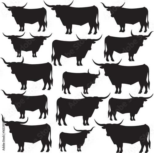 cow, cattle, bull, bovine, farm animal, farm, agriculture, animal, mammal, horned, outline, graphic, illustration, drawing, vector, design, pattern, repetition, grid, multiple, isolated, white background, farm animal, beef, meat, herd, group, collection, dairy, ranch, field, pasture, grazing, standing, profile, full body, simple, graphic design, silhouette