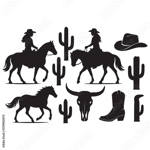 cowgirl, wild west, illustration, animal, nature, vector, america, arizona, cowboy, graphic, horizontal, lifestyle, one person, outline, running, vignetting, texas, trendy, west, western, american, bull, boot, cowboy hat, cattle, doodle, collection, earthy, desert, hand-drawn, fun, gun, horse, long hair, people, set, riding, wild, rifle, adult, rodeo, adventure, skull, sport, equestrianism, horseriding, line art
