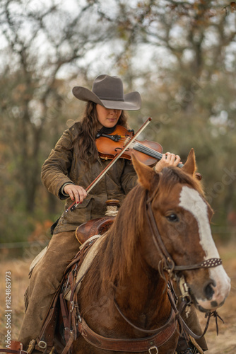 Cowgirl Woman Wearing Cowboy Hat Looking Down and Playing Fiddle Violin While Sitting On Brown and White Horse In Front of Trees and Cloudy Sky