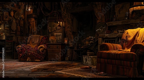 room, living, interior, armchair, chair, lamp, vintage, cosy, cluttered, old, wood, floor, rug, blanket, throw, cushion, pillow, wall, window, picture, frame, fireplace, hearth, mantle, furniture, side, table, cabinet, drawer, gaud, decoration, decor, rustic, home, house, wooden, light, dark, shadow, warm, inviting, comfortable, homelike, atmosphere, style, design, detail, texture