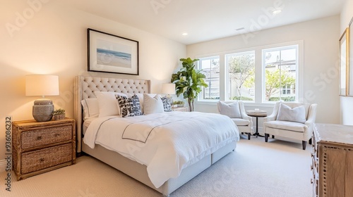bedchamber, interior, design, home, house, luxury, furniture, bed, bedding, pillow, nightstand, lamp, rug, carpet, white, cream, beige, decor, window, window, view, natural, light, sun, sky, plant, art, painting, frame, cosy, modern, comfortable, relaxing, peaceful, minimalist, stylish, elegant, roomy, clean, bright, airy, living