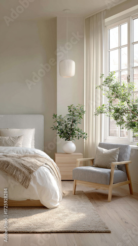 bedchamber, cosy, modern, natural, element, soft, lighting, serene, comfortable, bed, greenery, large, window, warm, light, stylish, chair, peaceful, retreat, decor, interior, design, relaxation, home, furniture, textile, item, minimalist, room, decoration, apartment, architecture, house, living, couch