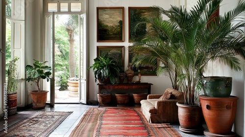 living room, plant, art, sofa, door, natural light, decor, interior, textile, relaxation, greenery, tradition, architecture, cosy, painting, furniture, space, aesthetic, design, atmosphere, home, calmness, style, vintage, comfort, material, ambience, colours, organic, indoor, environment, elegance, warmth, scene, layout, nature, view, arrangement, charme, brightness, artistic, peaceful, inviting, landscape, detail, craftsmanship, heritage, urban