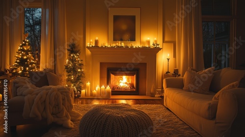 Cozy and Warm Living Room Decorated for Winter with Firelight and Soft Lighting Atmosphere
