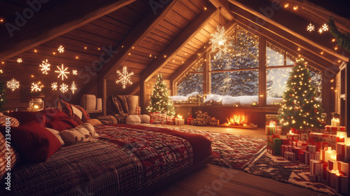 attic, bedchamber, tree, cosy, decorate, warm, light, festive, present, tinsel, design, comfy, rustic, accent, winter, ambience, set, magic, motif, space, greenery, candle, holiday, stock, bow, comfort, style, arrangement, twinkle, sparkle, display, cheerful, mantle, bed, plaid, corner, window, seasonal, peaceful, furniture, ornament, craft, aesthetic, trim, theme, fireplace, snowy
