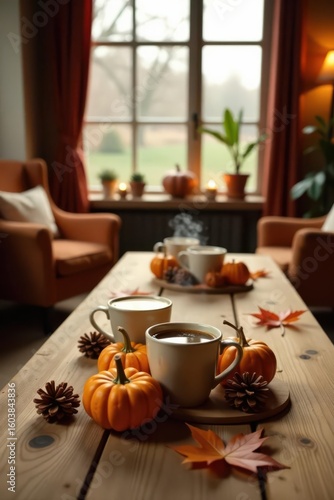 Cozy Autumn Afternoon Warm Beverages and Miniature Pumpkins on a Rustic Wooden Table