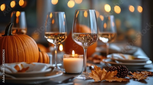 autumn, dinner, table, setting, pumpkin, candle, wine, goggles, festive, elegant, cosy, thankful, toast, rustic, season, event, party, ambience, nature, decor, surface, food, dine, main, course, charger, banquet, platter, design, pair, flair, menu, glow, charme, floral, puckered, soft, gold, lighting, shallow, depth, field, intricate, reflections, family, gathering, celebration, harvest
