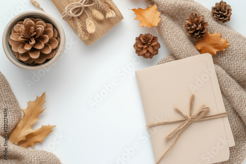 autumn, flat, lay, notebook, pine, cone, leaf, warm, tone, natural, element, cosy, decor, fabric, seasonal, rustic, styling, writing, creativity, nature, accessory, twine, tabletop, home, craft, aesthetic