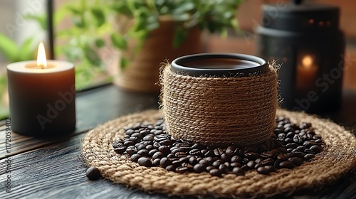 hot drink, cup, bean, candle, autumn, cosy, rustic, wood, table, home, warm, drink, hot, dark, brown, aroma, fragrance, comfort, relax, peace, serenity, morning, evening, still, life, interior, window, plant, light, shadow, textured, detail, natural, simple, elegant, mellow, mood, atmosphere, scene, setting, background
