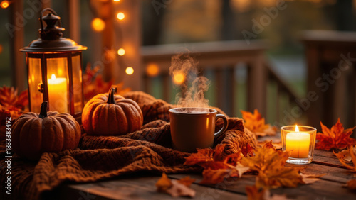 autumn, fall, pumpkin, pumpkin, hot drink, mug, candle, candle, cosy, warm, seasonal, still life, maple leaf, leaf, wooden table, table, lantern, glowing, ambience, rustic, harvest, thanksgiving, holiday, home decor, comfort, relaxing, season, fall season, autumn season, tea, hot drink, autumn color, orange, brown, golden light, bokeh, outdoors, deck, wool, aesthetic, serene, peaceful, morning