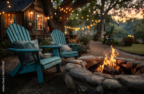 Cozy backyard fire pit gathering with string lights, teal Adirondack chairs, comfortable pillows. Stone fire pit with active flames, gravel ground, green grass, trees creates serene evening
