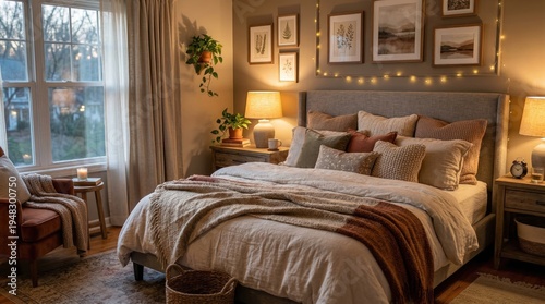 bedchamber, interior, bed, pillow, blanket, lighting, warm, cosy, comfort, relaxation, home, design, decor, furniture, room, window, curtain, artwork, frame, wall, nightstand, lamp, basket, plant, neutral, beige, brown, soft, daylight, atmosphere, lifestyle, domestic, elegant, serene, calm, residential, style, living, peaceful, aesthetic, space, texture, detail, composition, background