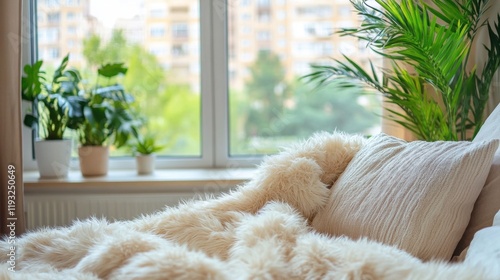 cosy, bedchamber, blanket, soft, window, plant, greenery, decor, interior, natural light, comfort, relaxing, calmness, home, pillow, serene, lifestyle, furnishing, cushion, modern, warm, style, fabric, warmth, foliage, residential, relaxation, bright, atmosphere, homelike, arrangement, peaceful, simplicity, nature