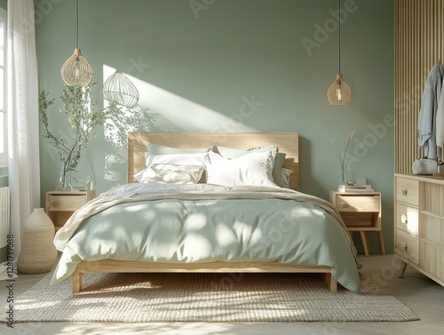 bedchamber, bed, green, light, wood, lighting, wall, decor, design, interior, furniture, lamp, curtain, window, modern, cosy, simple, serene, calm, peaceful, clean, texture, rug, soft, natural, plant, shadow, sunlight, room, bedding, white