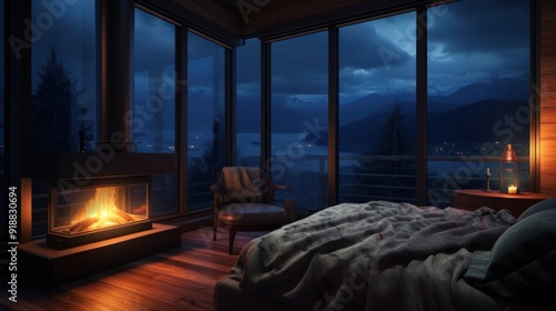 bedchamber, fireplace, night, mountain, window, view, cosy, warm, fire, wood, dark, light, lamp, candle, room, home, interior, design, comfortable, modern, contemporary, luxury, house, vacation, travel, relax, sleep, rest, romantic, love, living, style, architecture, cabin, filed, snow, lake, water, sky, cloud, tree, forest, nature