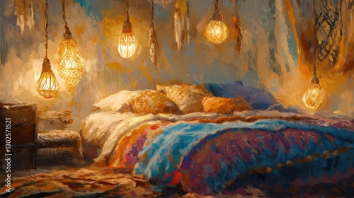 Cozy Bedroom with Warm Lighting and Colorful Textiles