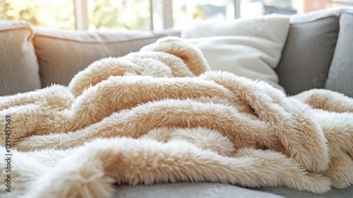Cozy blanket drapes on couch in bright living room; warm home design, lifestyle