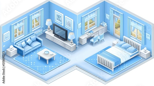 room, bedchamber, living, isometric, interior, design, furniture, decor, apartment, house, home, modern, style, blue, colours, sofa, bed, chair, table, window, picture, television, drawing, illustration, graphic, image, art, rendering, three-dimensional, perspective, layout, plan, visual, cosy, relaxing, comfort, clean, simplicity, stylish