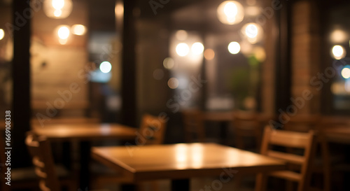 Cozy blurred cafe interior at night with warm glowing lights and empty wooden tables, inviting restaurant ambiance background