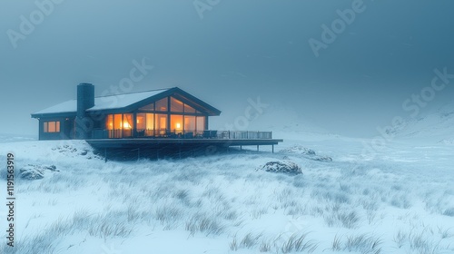 cabin, house, home, snow, winter, landscape, cold, isolated, remote, serene, peaceful, quiet, tranquil, blizzard, storm, snowy, mountain, hill, wilderness, nature, scenery, view, beautiful, picturesque, cosy, warm, light, illuminated, glasses, window, deck, fireplace, fire, wood, stone, grass, field, frosted, blowing, wind, drift, stillness, silence, night, dusk