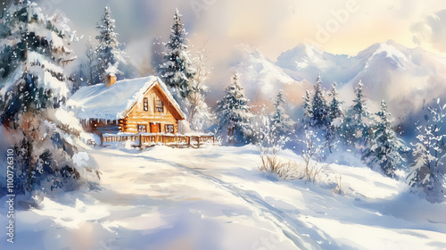 cabin, snowy, landscape, mountain, tree, winter, cosy, nature, scenery, peaceful, tranquil, holiday, rustic, wood, snow, sunlight, path, forest, serene, picturesque, scenic, cold, environment, wilderness, retreat, travel, adventure, landscaped, watercolor, winter scene, idylli, rural, countryside, seasonal, frost, beauty, atmosphere, charme, escape