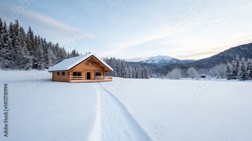Cozy cabin retreat surrounded by snow covered trees and mountains, inviting warmth