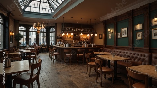 cafes, eatery, interior, design, modern, dark, wood, table, chair, lighting, lamp, bulb, pendant, light, bar, counter, shelf, menu, hot drink, espresso, machine, plant, pot, window, city, view, brown, leather, seating, cosy, atmosphere, warm, inviting, stylish, elegant, sophisticated, moody, comfortable, mellow, vintage, retro, aesthetic, space