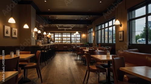 cafes, hot drink, bar, eatery, interior, design, lighting, wood, floor, chair, table, modern, warm, cosy, elegant, stylish, amber, gold, dark, brown, rustic, vintage, industrial, pendant, light, counter, shelf, bottle, drink, menu, seating, atmosphere, space, room, window, wall, comfortable, relaxing, mellow, sophisticated