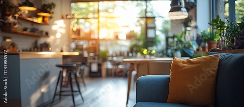 Cozy cafe interior with sunlight streaming through windows, plants, and inviting decor