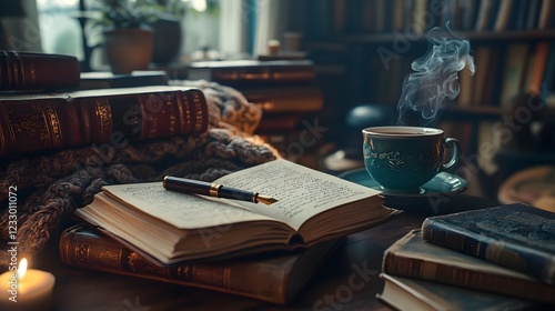 writing, journal, fountain, pen, candlelight, tea, cosy, desk, warm, book, creativity, serenity, inspiration, introspection, nostalgia, aesthetic, ambience, thought, expression, personal, artistic, scene, quiet, warmth, comfort, leather