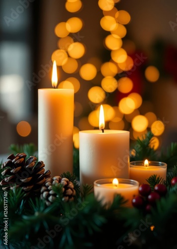 Cozy christmas candle setting with pine cones and festive garland against bright bokeh lights bokeh red bokeh abstract background glow design light texture effect sparkle