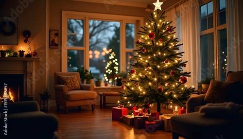 Cozy Christmas Eve Illuminated Christmas Tree in Warm Living Room