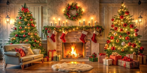 Cozy Christmas interior with a decorated tree, stockings hanging by the fireplace, and twinkling lights , Christmas, interior