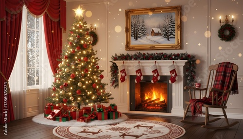 christmas, living, room, tree, decoration, fireplace, gift, stocking, cosy, warmth, festive, holiday, red, curtain, rug, present, light, ornament, home, celebration, winter, family, cheer, joy, scene, interior, atmosphere, green, snow, relaxation, spirit, gathering, tradition, seasonal, comfort, artwork, ambience, hearth, cheerfulness, party, decor, nostalgic, glow, wonderland, togetherness, corner, festivity, indoor, relaxing