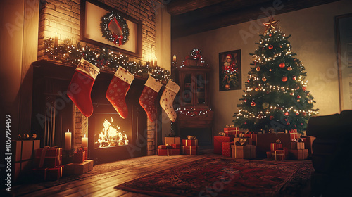 christmas, fireplace, stocking, festive, holiday, winter, cosy, home, living room, christmas tree, christmas lights, christmas ornament, present, gift, decorated, warm, candle, glowing, holiday season, cheerful, family, celebration, tradition, christmas eve, winter landscape, christmas spirit