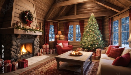 Cozy Christmas log cabin interior with fireplace, tree, and presents.