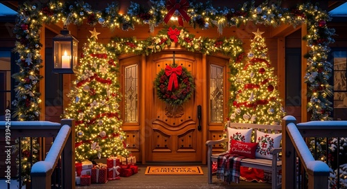 christmas, holiday, home, decoration, tree, light, present, chaplet, festive, seasonal, winter, snow, porch, door, garland, bow, lantern, bench, pillow, rug, merry christmas, winter landscape, cosy, warm, inviting, celebration, tradition, decor, residential, exterior, night, evening, ambience