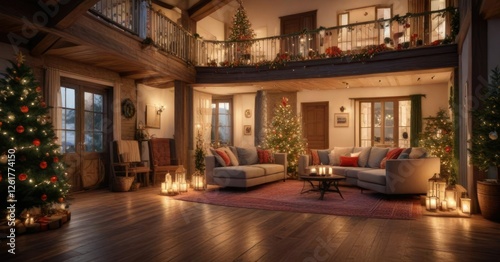 Cozy Christmas villa interior with twinkling lights and festive decorations, villa decor, holiday lights, snowflake lights