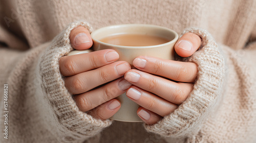 Cozy close up of hands holding warm cup of tea wrapped in soft beige knitted sweater, evoking comfort and relaxation on chilly day