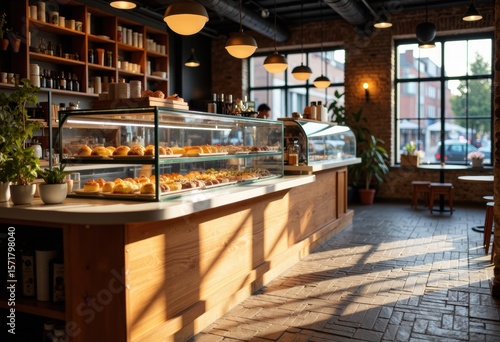 hot drink, shop, bakery, pastry, baked, good, interior, warm, lighting, wooden, counter, display, glasses, modern, pendant, window, natural, light, cosy, atmosphere, seating, brick, floor, shelf, plant, urban, casual attire, cafes, breakfast, snack, dessert, drink, beverage, relaxing, inviting, ambience, sunlight, furniture, decor, space, copy space