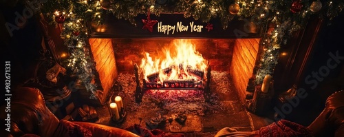 Cozy fireplace ambiance adorned with festive decorations, celebrating a warm and joyful New Year atmosphere.