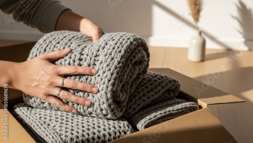 Cozy gray knitted blankets being carefully packed into a cardboard box for storage or moving