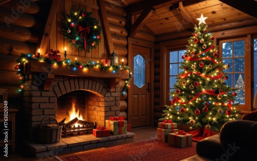 Cozy holiday scene with a fireplace and decorated Christmas tree.