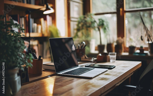 laptop, blank, screen, modern, cosy, home, workspace, work, office, setup, plant, technology, wooden, desk, design, indoor, warm, productivity, inviting, interior, comfort, atmosphere, nature, serene, relaxed, contemporary, stylish, green, creative, peaceful, comfortable, house, natural, furniture, living, quiet